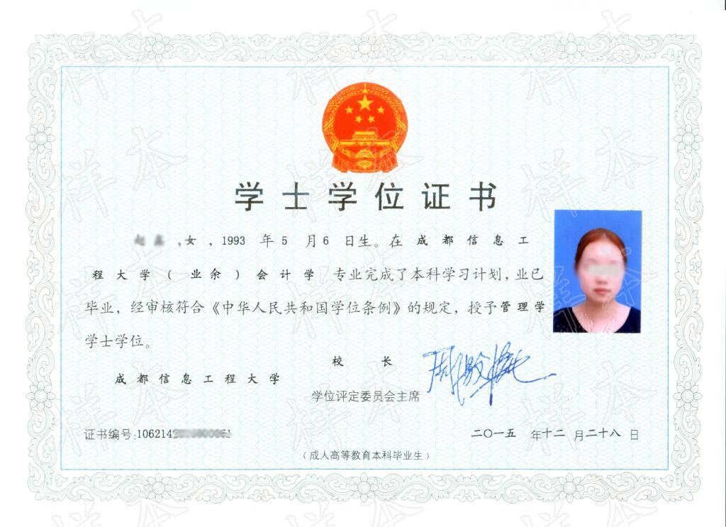 答:毕业时由成都信息工程大学颁发属于国民教育系列的成人高等教育学历文凭,教育部电子注册,,国家承认学历,毕业证书可在教育部唯一学历证书查询网站——中国高等教育学生信息网(www.chsi.com.cn)查询。学校各专业对应的职业资格证书,以行业主管部门颁发的职业资格证书(初级)为主,是许多岗位上岗必备的职业资格证书。